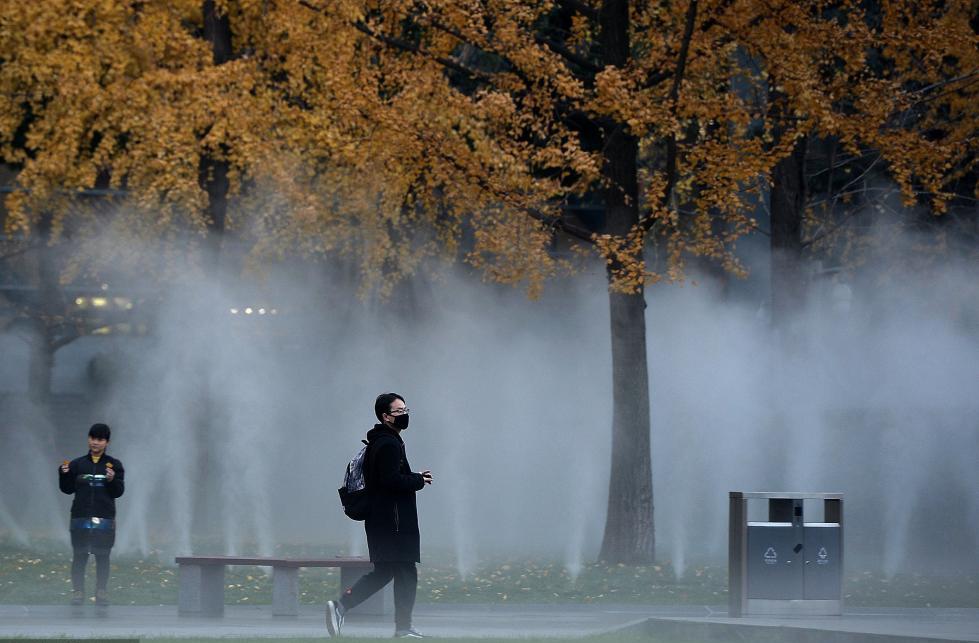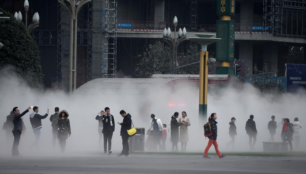 2017年12月23日,成都。天府廣場西側和南側有了新變化——上午10點,綠油油的草坪上空開始籠罩著層層白色霧氣,仿佛置身于仙境一般。走近一點,還有水霧襲來,平添一分清新和涼意。