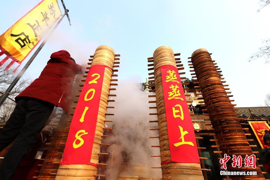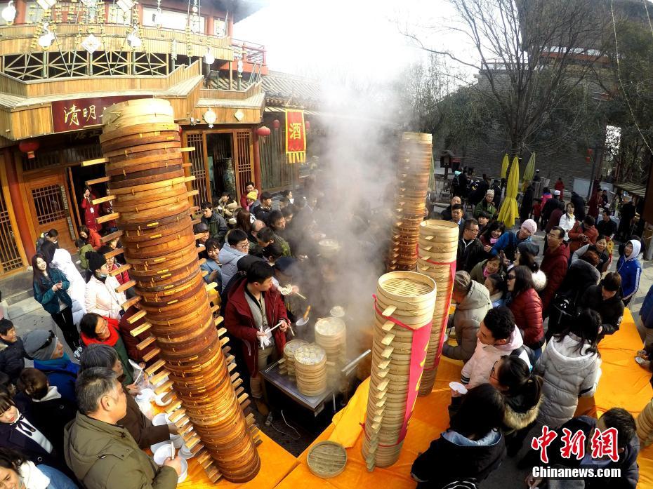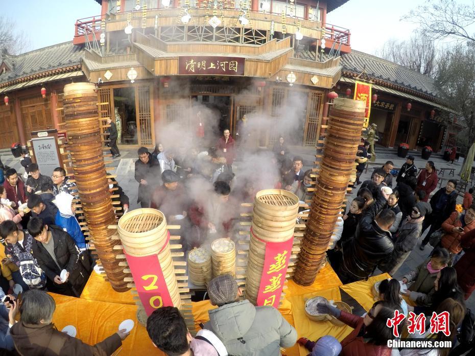 2018年1月1日,河南開封清明上河園孫羊正店門前,現(xiàn)場(chǎng)高高疊起的小籠包熱氣騰騰,小籠包上喜慶的紅字寫著“2018”“蒸蒸日上”。“宋徽宗”帶領(lǐng)“后宮佳麗”為游客免費(fèi)發(fā)放剛剛蒸好的小籠包,寓意新的一年“蒸蒸日上”,吸引數(shù)千名游客爭(zhēng)相品嘗求好運(yùn)。據(jù)清明上河園市場(chǎng)部石經(jīng)理介紹,為了給游客送上這份新年祝福,清明上河園啟用了多個(gè)地方一起蒸小籠包,當(dāng)天共準(zhǔn)備了2018籠開封名吃“灌湯包”,在多個(gè)發(fā)放點(diǎn)陸續(xù)為民眾送上新年的“免費(fèi)午餐”,祝愿大家都能夠在新的一年里“蒸蒸日上”。中新社記者 王中舉 攝