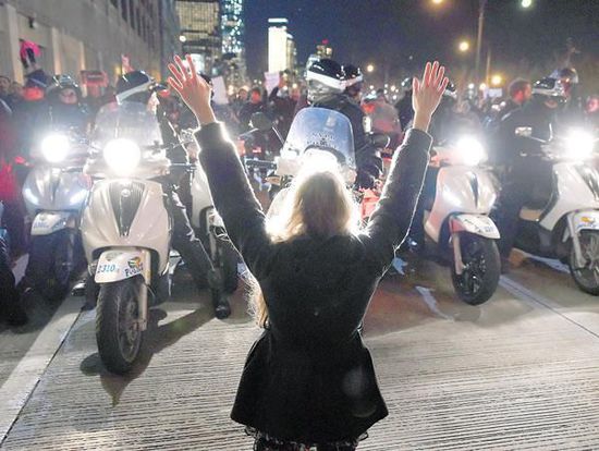 12月3日,美國(guó)紐約一個(gè)大陪審團(tuán)投票決定,將不起訴扼死黑人小販的涉事警察。裁決宣布后,紐約市長(zhǎng)呼吁不滿者和平示威,紐約市民則再次走上街頭抗議。