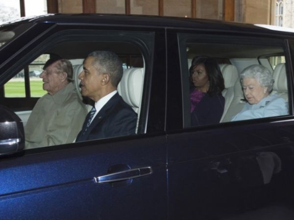 美國(guó)總統(tǒng)奧巴馬與妻子米歇爾22日到訪英國(guó)溫莎城堡,英國(guó)女王伊麗莎白二世與丈夫菲利普親王乘車(chē)迎接。只是,這次的司機(jī)是94歲的菲利普親王。奧巴馬坐上路虎汽車(chē)的副駕駛座,伊麗莎白二世和米歇爾坐在后排座位。奧巴馬晚些時(shí)候告訴記者:“我還從來(lái)沒(méi)有坐過(guò)親王開(kāi)的車(chē)。我得說(shuō),車(chē)開(kāi)得很平穩(wěn)?!?/p>