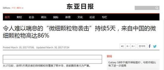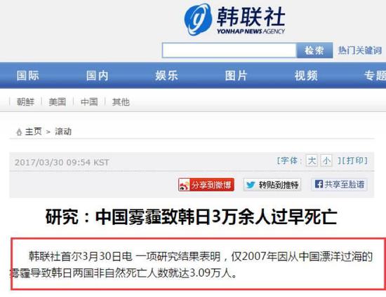 韓聯(lián)社的意思似乎是:連中國(guó)學(xué)者做的研究都能證明,韓國(guó)人的健康被中國(guó)霧霾所傷。