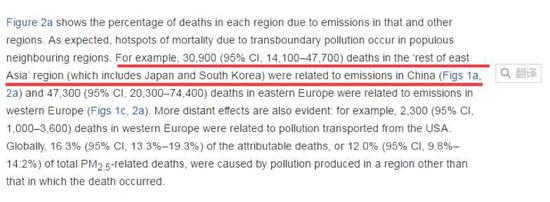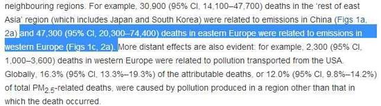 翻譯:東亞其他地區(qū)(包括日本韓國(guó))有3.09萬(wàn)人的死亡與中國(guó)的污染物排放存在關(guān)聯(lián)。(2007年數(shù)據(jù)——環(huán)環(huán)注)