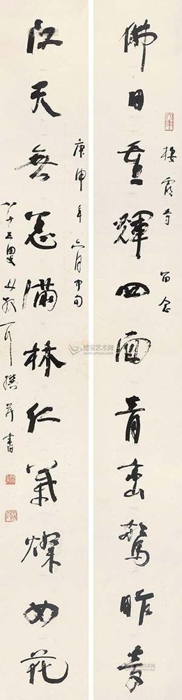 北京匡時(shí)國(guó)際拍賣(mài)有限公司描述稱,林散之先生的這副作品作于1980年,為棲霞寺所書(shū),林氏時(shí)年83歲,已是人書(shū)俱老的時(shí)期……林散之筆下的線條曲中有直,直中寓曲,剛中有柔,柔中寓剛,從而達(dá)到一種清逸虛妙之境。林散之的草書(shū)風(fēng)格雖然欹正相生,但往往會(huì)把其中的變化復(fù)歸平正,偏能得中,奇而能穩(wěn),故顯得格外的老成與持重。由于林散之的藝術(shù)思想受佛家影響較深,而此為“三論宗”的發(fā)源地棲霞寺所書(shū),更能見(jiàn)其書(shū)寫(xiě)之虔誠(chéng)。