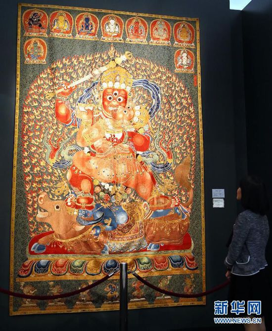 一位觀眾在香港佳士得2014年秋季拍賣會(huì)預(yù)展上觀看明永樂(lè)御制紅閻摩敵刺繡唐卡(11月21日攝)。新華社記者李鵬攝