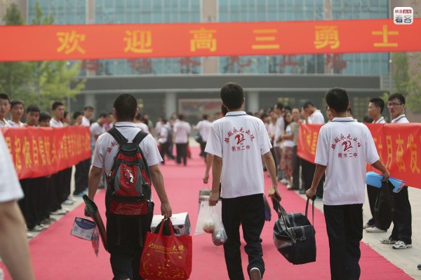 圖為2013年5月24日,衡水二中高三學(xué)生經(jīng)過短暫的休息返校,這次返校后他們下一次休息將是高考結(jié)束。歸校時,他們被譽為“勇士”,所有高三班主任則站在門口兩側(cè)迎接學(xué)生歸來。
