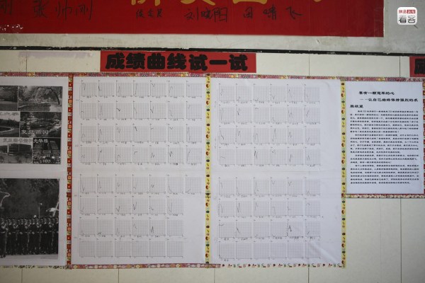 圖為2013年5月10日,學(xué)校走廊上貼著的“成績曲線”,將每個學(xué)生歷次考試成績以曲線的方式展現(xiàn)。而這樣類似的成績表、成績單布滿了走廊的每一面墻。