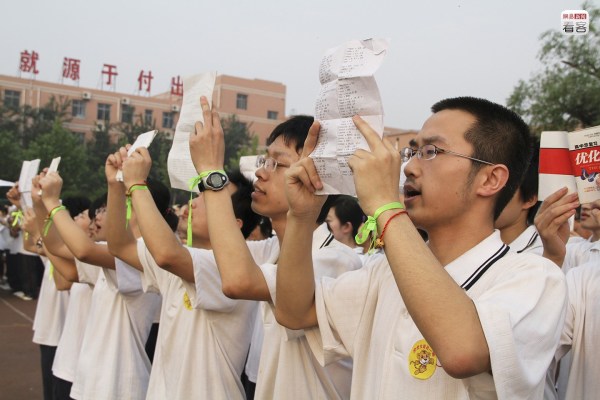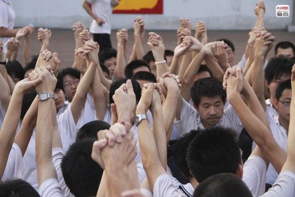 高考進(jìn)行前,學(xué)校還會帶領(lǐng)學(xué)生進(jìn)行最后一輪鼓勁,老師們穿著紅色T恤,背后寫著“和你在一起”,學(xué)生們則集體穿著白色T恤,在老師的帶領(lǐng)下喊口號。圖為2011年6月8日,學(xué)生們即將參加高考。
