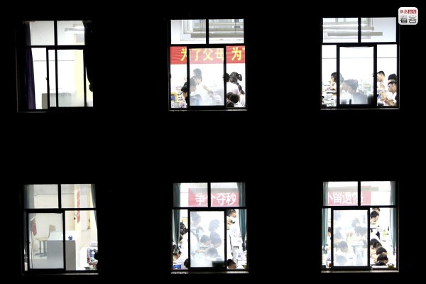 圖為2013年5月24日,學(xué)生們在上晚自習(xí),教室的標(biāo)語上寫著“為了父母”、“爭分奪秒”等字樣。