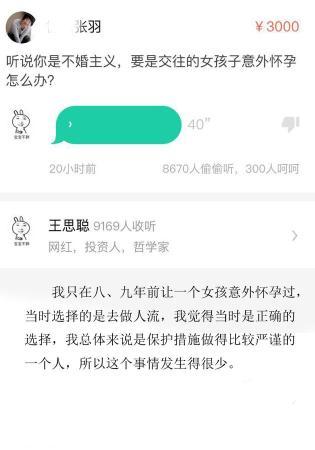 近日,某醫(yī)院醫(yī)生張羽在某平臺中向王思聰提問:“聽說你是不婚主義,要是交往的女孩子意外懷孕怎么辦?”在40秒的回答中,王思聰爆料自己毫不手軟:“我只在八九年前讓一個女孩意外懷過孕,但后來大家的選擇是流掉,我覺得是正確的選擇。 但現(xiàn)在我的保護措施是非常好的,一般不會有意外了。”前往“偷聽”的網(wǎng)友們紛紛表示:“老公坦誠得讓我震驚啊……”“感覺要上娛樂八卦頭條的節(jié)奏!”