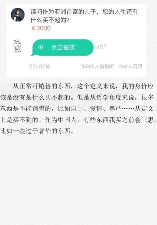 還有網(wǎng)友好奇首富獨子的消費觀,問王思聰平均在每個女朋友身上的花費是多少。王思聰給出的答案依然很實在:“從我17、8歲初戀到現(xiàn)在十幾年了,在每個女朋友身上的消費,完全取決于當年的我有多少錢,十七八歲的時候錢也不多,或許會買的幾百幾千的飾品,但隨著自己歲數(shù)越來越大,也會買幾萬,甚至幾十萬的東西,很難算出平均的花費,有一點是確定的,隨著歲數(shù)越來越大,可支配的資金越來越多,在每個女朋友身上花的錢是越來越多的?!?/p>