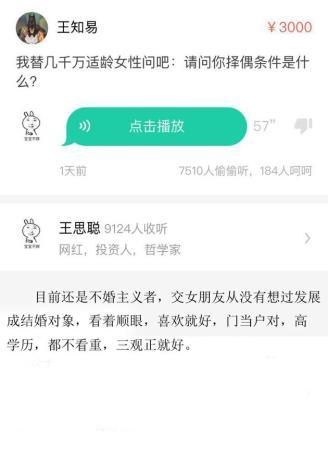 有網(wǎng)友代表幾千萬適齡女性向王思聰發(fā)問,“你的擇偶標準是什么”,王思聰坦言:“說實話,沒有考慮沒有想過這些問題,首先我目前是不婚主義者,沒想過要結(jié)婚,交女朋友有交,但從沒想過發(fā)展成結(jié)婚對象,至于交女朋友標準,其實沒什么標準,我喜歡就好,我和一般傳統(tǒng)家庭或是老一代的人思想不太一樣,沒想過要門當戶對,高學歷啊,知書達理啊這些,都不是很看重,三觀正比較重要,再就是我喜歡,我看順眼就好,其他真的沒別的標準了?!?/p>