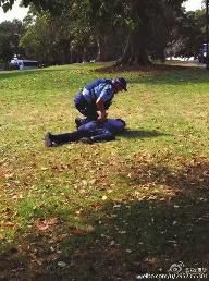 一名目擊導(dǎo)游說(shuō):“剛才有兩個(gè)客人在悉尼草坪上方便,讓警察看見(jiàn)了。警察追他們,他們提著褲子跑。他們惱羞成怒,要打警察。警察一個(gè)過(guò)肩摔,把一個(gè)男的摔地上骨折了?,F(xiàn)在救護(hù)車(chē),警車(chē)都過(guò)來(lái)了。”