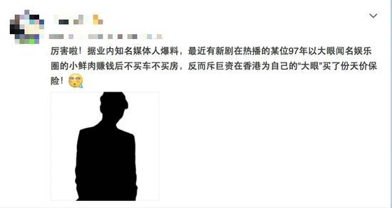 5月1日,某大號在社交平臺爆料稱:“厲害啦!據(jù)業(yè)內(nèi)知名媒體人爆料,最近有新劇在熱播的某位97年以大眼聞名娛樂圈的小鮮肉賺錢后不買車不買房,反而斥巨資在香港為自己的“大眼”買了份天價保險!”