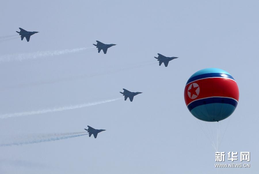 4月15日,戰(zhàn)斗機(jī)在朝鮮首都平壤舉行的閱兵式上進(jìn)行表演。當(dāng)日,朝鮮在金日成廣場(chǎng)舉行盛大閱兵式,慶祝金日成誕辰100周年。朝鮮國家最高領(lǐng)導(dǎo)人金正恩出席閱兵式并發(fā)表演講。 新華社記者張利攝