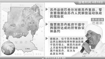 卡塔爾半島電視臺(tái)19日援引蘇丹官方通訊社的消息說(shuō),蘇丹總統(tǒng)巴希爾當(dāng)天在北科爾多凡州首府歐拜伊德的群眾集會(huì)上發(fā)表講話,稱只有用大棒才能懲罰南蘇丹,蘇丹將通過(guò)軍事手段解放南蘇丹。
