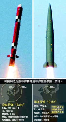 據(jù)韓國(guó)《朝鮮日?qǐng)?bào)》20日?qǐng)?bào)道,韓國(guó)19日首次對(duì)外公開(kāi)了自制巡航導(dǎo)彈和彈道導(dǎo)彈。巡航導(dǎo)彈“玄武-3”最大射程1500公里,可精確打擊朝鮮全境核與導(dǎo)彈基地等主要戰(zhàn)略設(shè)施;彈道導(dǎo)彈“玄武-2”射程300公里,一發(fā)可將幾十個(gè)足球場(chǎng)大的面積夷為平地。