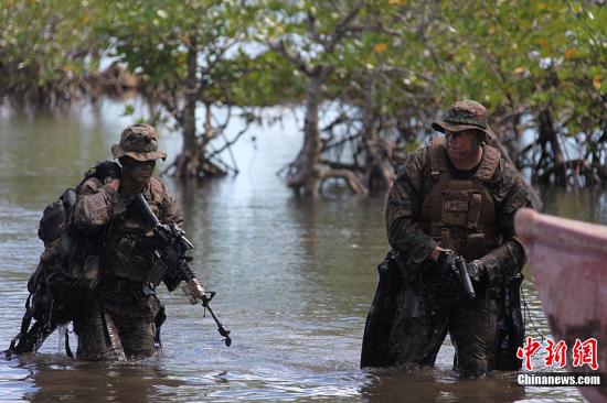 4月25日,美國與菲律賓“肩并肩2012”聯(lián)合軍演參演部隊(duì)在菲律賓南部巴拉望省普林塞薩港市的阿魯甘灣舉行“兩棲登陸”演練,美菲雙方近百名海軍陸戰(zhàn)隊(duì)士兵參加。這也是美菲“肩并肩2012”聯(lián)合軍演開幕10天以來,開放媒體采訪規(guī)模最大的一場軍事演習(xí)活動(dòng)。圖為美菲海軍陸戰(zhàn)隊(duì)先遣小分隊(duì)登上灘頭。記者張明攝