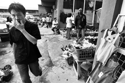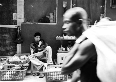 2002年,一名中國(guó)男子從尼日利亞拉各斯中國(guó)城的布店走出來。
