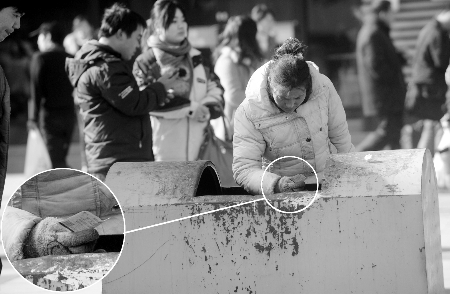 昨日上午11時許,在鄭州火車站北出站口旁,一名穿藍色棉襖的女子一直站在垃圾桶旁邊,手拎著裝有塑料瓶的黑色袋子,見人扔?xùn)|西就盯著人家的手。