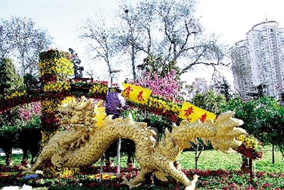 此次花展分別布置了“雙龍競(jìng)春”、“綠島探春”等5個(gè)立體和平面花壇,有配花如牽?;ā⑷赖葍扇f(wàn)余盆,另有袖珍葉子、散尾葵、綠茉莉、夏威夷等近千盆點(diǎn)綴,其中景點(diǎn)“樂(lè)童嬉春”的“魔方”使用7000余枝鮮切花康乃馨制成。