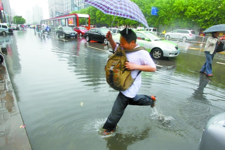 昨天下午3時(shí),記者在東風(fēng)路與文化路交叉口的地下隧道內(nèi)看到,有轎車已被水淹滅了,難以動(dòng)彈,地下隧道中的積水可沒過輪胎。金水路與東明路交叉口西約100米路南,積水嚴(yán)重,水深幾乎沒過轎車輪胎。豐慶路與三全路交叉口附近的豐慶路小學(xué)門前也是宛如“海洋”,積水沒過自行車大半個(gè)車輪。放學(xué)的部分小學(xué)生無法通行,被人背著過路。巡防隊(duì)員解釋稱,此處地勢(shì)低洼,排水不暢,逢雨必淹,孩子們雨天上下學(xué)很不安全。