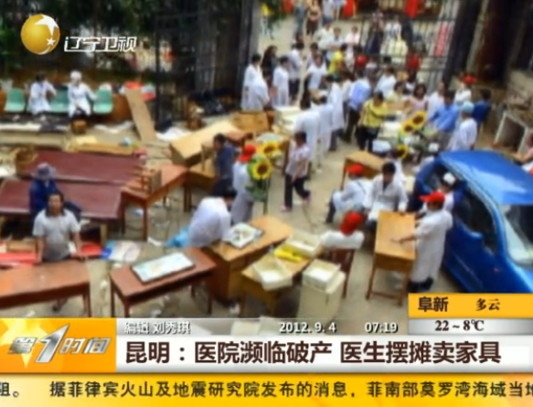 9月1日下午,在位于西山區(qū)麻園路9號(hào)的云南博愛醫(yī)院100平方米左右的院子里,各式各樣的家具雜亂地?cái)[放著,有病床、床頭柜,還有護(hù)士辦公的前臺(tái)。家具中間站著幾十個(gè)人,穿著醫(yī)生和護(hù)士的制服,賣力地叫賣著。該醫(yī)院副院長稱,博愛醫(yī)院租用的場地到期,而且醫(yī)院投資失敗瀕臨破產(chǎn),只得變賣資產(chǎn)安置醫(yī)護(hù)人員。