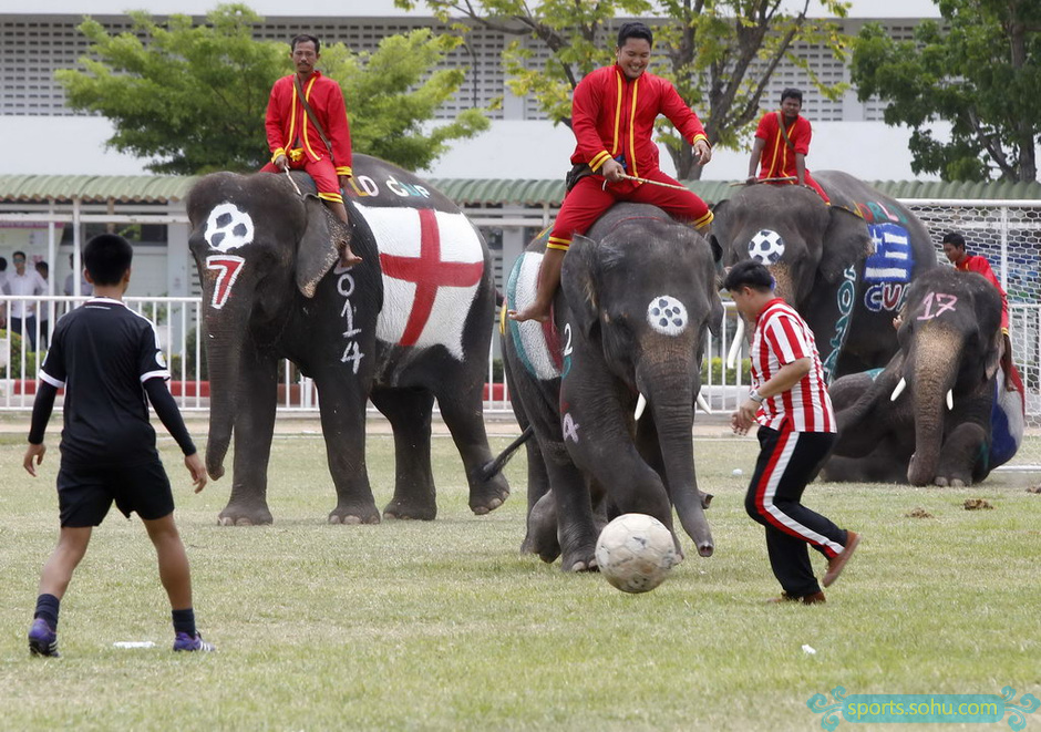 學(xué)生們與身上畫有世界杯參賽球隊國旗圖案的大象踢足球