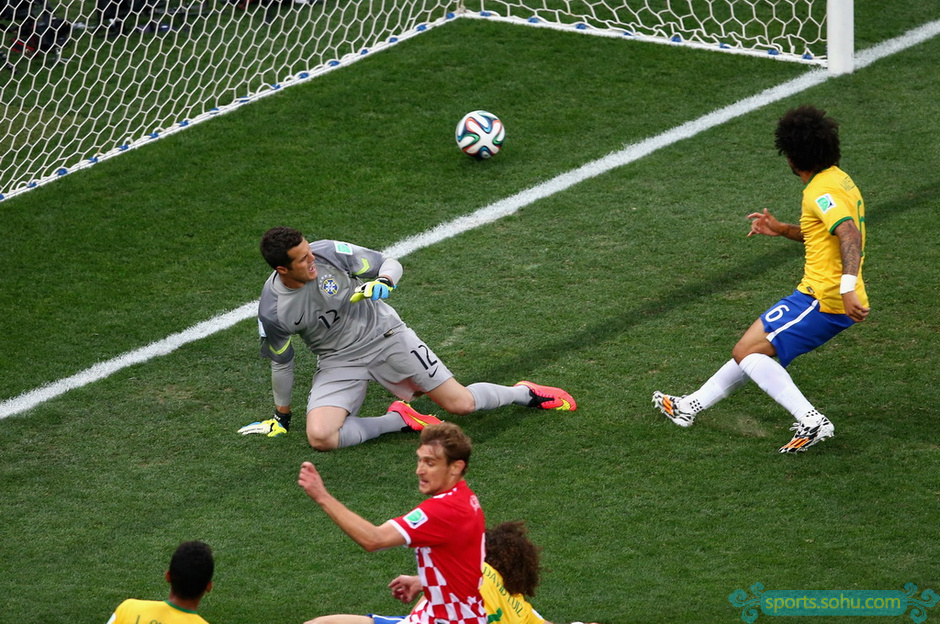 北京時間6月13日凌晨4時,2014年巴西世界杯揭幕戰(zhàn)在圣保羅競技場(科林蒂安競技場、伊塔蓋拉球場)展開,東道主巴西3-1逆轉(zhuǎn)東歐勁旅克羅地亞。第10分鐘,奧利奇左路傳中,馬塞洛不慎自擺烏龍。第29分鐘,內(nèi)馬爾依靠個人能力扳平比分。第69分鐘,弗雷德制造爭議點球,內(nèi)馬爾將球冷靜罰入,反超比分。第91分鐘,奧斯卡反擊中捅射再下一城。圖為馬塞洛烏龍進球瞬間。