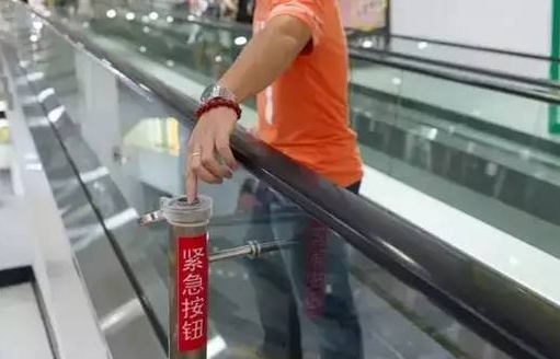 萬一乘坐電梯出事,你必須了解無論上的方向還是下的方向,手扶電梯的一側下方都有一個紅色的緊急停止按鈕。
