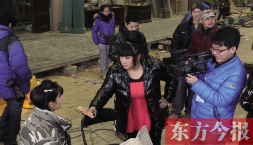 雖然“美食街”上人跡罕至,然而當(dāng)節(jié)目組來(lái)到《大河兒女》的攝影棚時(shí),卻發(fā)現(xiàn)這里人頭攢動(dòng)。劇中的明星大腕、劇組工作人員、媒體記者將這里圍得水泄不通。而香香最關(guān)心的則是:來(lái)河南拍戲的明星們?nèi)绾慰创幽厦朗衬??為?tīng)到他們的心聲,香香客串起了娛樂(lè)記者。