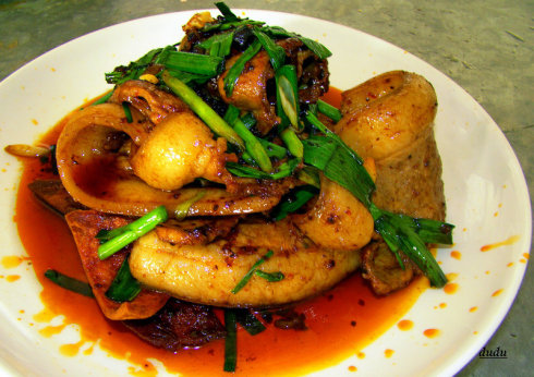 1:準(zhǔn)備新鮮的五花肉一塊,干辣椒,洋蔥,蒜苗,木耳等配料適量。
