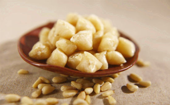 做法:先將白砂糖放入鍋中加少許水,用文火煎熬至粘稠,再加入松子仁,調(diào)勻。然后繼續(xù)煎熬,直至用鏟子挑起成絲狀,不粘手時(shí),停火,將糖倒在涂有食用油的盤中,待稍涼,將糖切成小塊,即可食用。