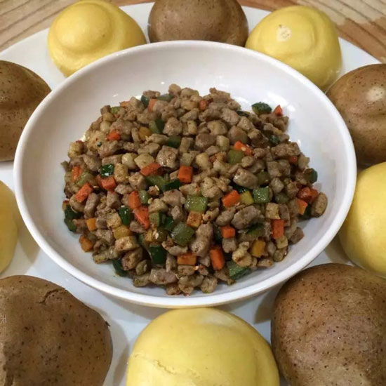 4、鍋中留少許油,蒜蓉炒香,然后倒入滑過(guò)油的肉丁,加入辣椒孜然粉,鹽,味精,雞粉,翻炒均勻就可以出鍋了,再搭配上精致的窩窩頭,相信您一定會(huì)愛不釋口!