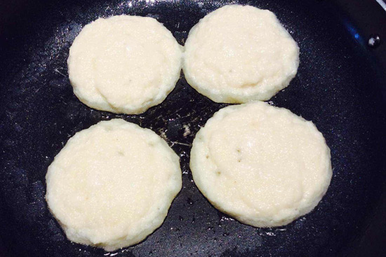 3、燒熱平底鍋,加入適量油,舀一勺土豆面糊,用勺子攤平成餅狀,煎至其底部凝固,翻面中小火繼續(xù)煎,煎至其兩面呈金黃色即可。