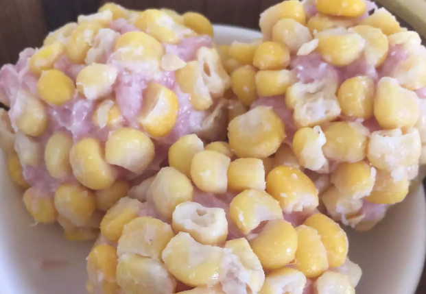 2、玉米粒煮成熟,放涼,裹上少許生粉增加粘性,備用。
