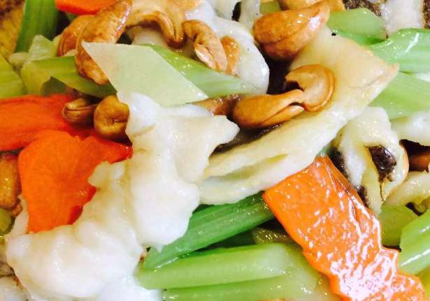 5、鍋置于火上,少量油燒熱,倒入姜片和胡蘿卜片,然后倒入焯過水的芹菜,翻炒片刻倒入魚肉,然后加入鹽,味精,香油,淀粉,一點(diǎn)清水,翻炒片刻,最后加入腰果翻炒均勻即可,最后在魚骨上撒上椒鹽就可以了。