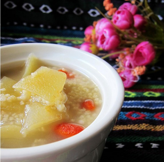 食材:蘋(píng)果1個(gè)、小米100g、水1000ml