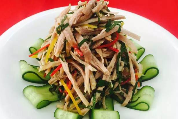 3.薄荷葉改刀成條,搭配青紅彩椒絲,連同手撕肉一起放進(jìn)盆中,用鹽,蒜蓉,白醋,香油和蔥油調(diào)味,攪拌均勻即可。