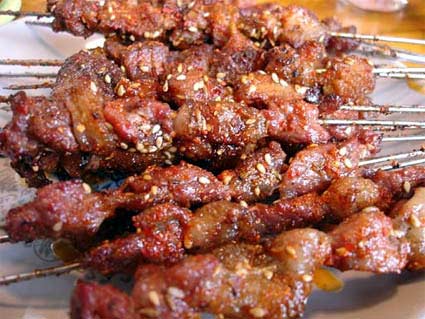 烤約兩分鐘之后,翻面,依次撒芝麻、孜然、再烤一兩分鐘,肉已經(jīng)九分熟時(shí),最后撒上辣椒粉。也有在九分熟時(shí),加糖的,糖能入味,糖化了之后,串亮,顏色漂亮。 烤好出爐之前,串最好反復(fù)擠壓,讓烤出的肉汁與調(diào)料充分融合入味。