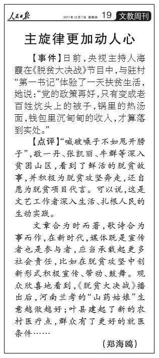 評論中還指出,文章合為時而著,歌詩合為事而作,在新時代,媒體既是宣傳者也是參與者,應(yīng)當(dāng)承載起更多社會責(zé)任,比如在脫貧攻堅中創(chuàng)新形式積極宣傳、帶動、鼓舞。觀眾欣喜地看到,《脫貧大決戰(zhàn)》播出后,河南蘭考的“山藥姑娘”生意越做越好;葉縣建起了新的農(nóng)村醫(yī)療點(diǎn),群眾有了更好的就醫(yī)條件……