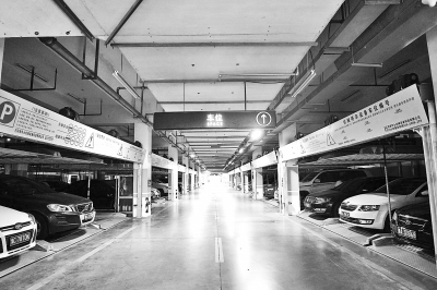 該停車場(chǎng)負(fù)一層是機(jī)械車庫(kù),停得滿滿當(dāng)當(dāng);負(fù)二層也是機(jī)械車庫(kù),但還有空位。
