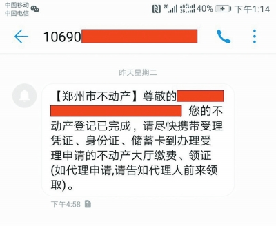 大河報記者了解到,鄭州市不動產(chǎn)登記中心目前正式推出了業(yè)務(wù)辦結(jié)的短信提醒服務(wù)。當(dāng)不動產(chǎn)登記部門在辦結(jié)申請人的相關(guān)申請后,便會給申請人(代理人)發(fā)去短信,提醒其及時前往不動產(chǎn)登記部門領(lǐng)取不動產(chǎn)登記證書、證明。“從業(yè)務(wù)辦結(jié)到領(lǐng)證還有一些內(nèi)部流轉(zhuǎn)程序,一般情況下,我們都是在繕證完成后24小時發(fā)送短信?!毕嚓P(guān)負(fù)責(zé)人介紹說。