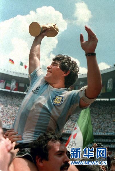 圖為1986年6月29日,馬拉多納高舉冠軍獎杯慶祝勝利。在1986年墨西哥世界杯決賽中,阿根廷隊以3比2戰(zhàn)勝聯(lián)邦德國隊奪得冠軍。新華社發(fā)
