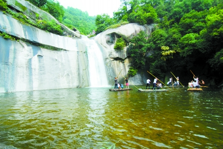 龍?zhí)稖仙角逅?,石奇崖險(xiǎn),頗具登臨之趣。整個(gè)峽谷兩側(cè)是花崗巖山體,一色的蒼青如黛,更顯巨石秀姿。大龍?zhí)陡浇囊粔K巨石酷似鱷魚頭,正伸入水中飲水,游人稱之為“鱷魚戲水”;“四連瀑”附近有塊巨石更是神奇,從對(duì)面山頭看,猶如豬八戒的頭,像是伸出水面偷看龍女洗澡,人們稱之為“八戒窺浴”;從后面看又酷似船頭,因此又叫“船石”;黑龍?zhí)杜赃呌腥龡l極像鯊魚的巨石,魚頭伸向潭水,美其名曰“三鯊鬧龍?zhí)丁?。此外,還有“絕壁掛雪”、“神龜過江”、“鯉魚跳龍門”等。奇石遍布,形態(tài)各異,惟妙惟肖,渾然天成。