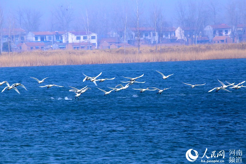 人民網(wǎng)鄭州3月14日電 (黃莎)春到黃河故道,和風送暖,綠柳吐翠。近日,河南省民權(quán)黃河故道國家濕地公園迎來一批“稀客”—— 一碧萬頃的龍澤湖湖面游蕩著數(shù)百只白天鵝。春水浩渺,天鵝起舞,給早春的黃河故道濕地公園增添了一道亮麗的風景線,吸引大批游人駐足靜賞。